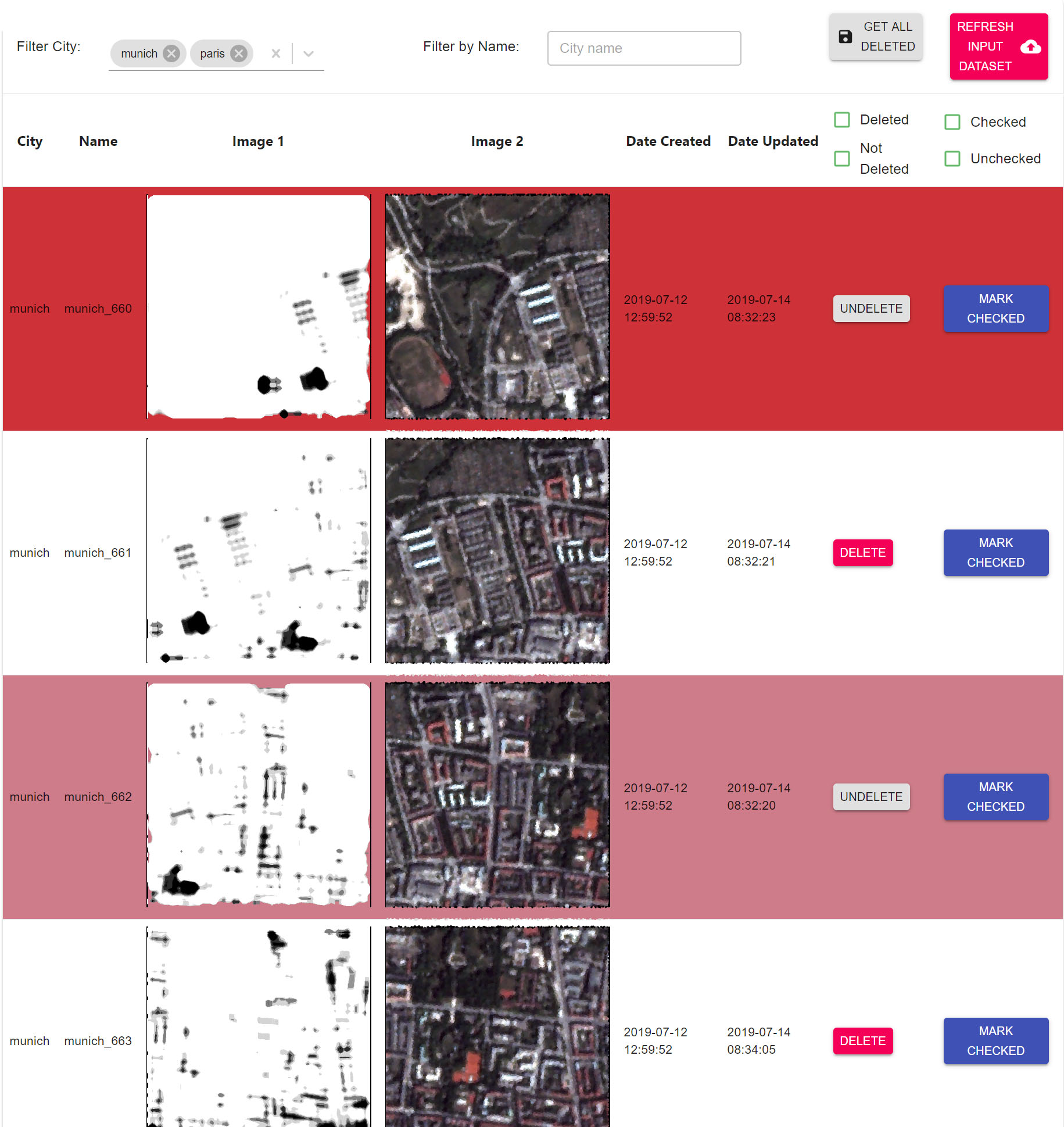 A image-by-image comparison platform highly optimized for efficient use. Built for large datasets and dynamic filtering. Defective images can be deleted from the input dataset.
