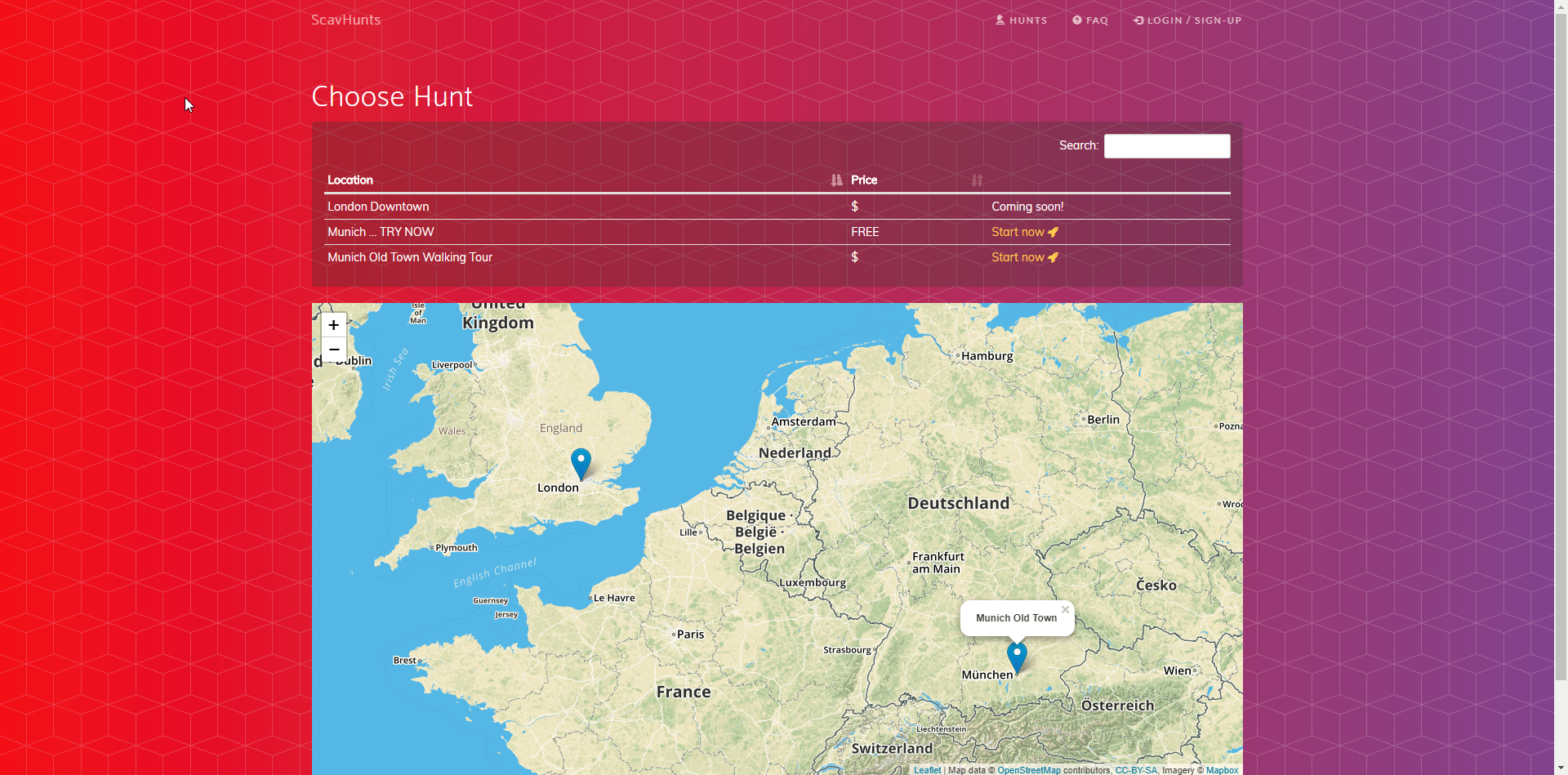 This is a browser-based scavenging hunt game for mobile devices. You can select different cities and purchase via credid card digital content. Users get a limited access token and can manage their profile.