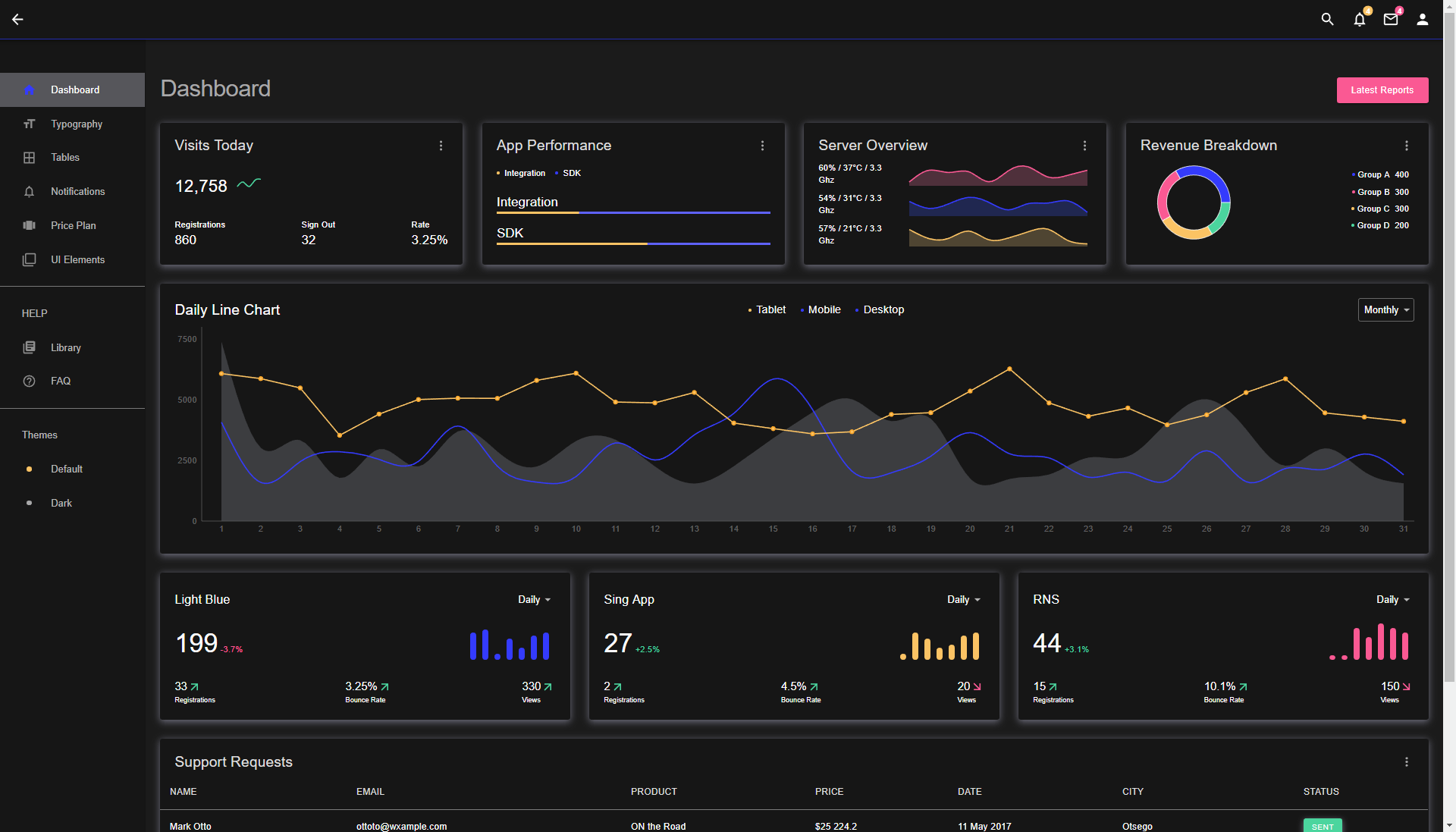 Most up-to-date Admin Dashboard base on React. Utilizes Redux and features libaries for tables, charts and maps. Dark and light theme available.