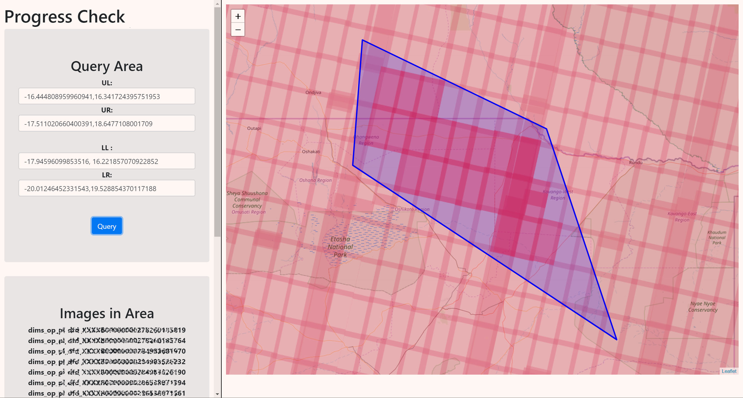 Global map visualization of satellite image capture progress. Quering of specific areas via SQL possible. Visual feedback of the selected image tiles.